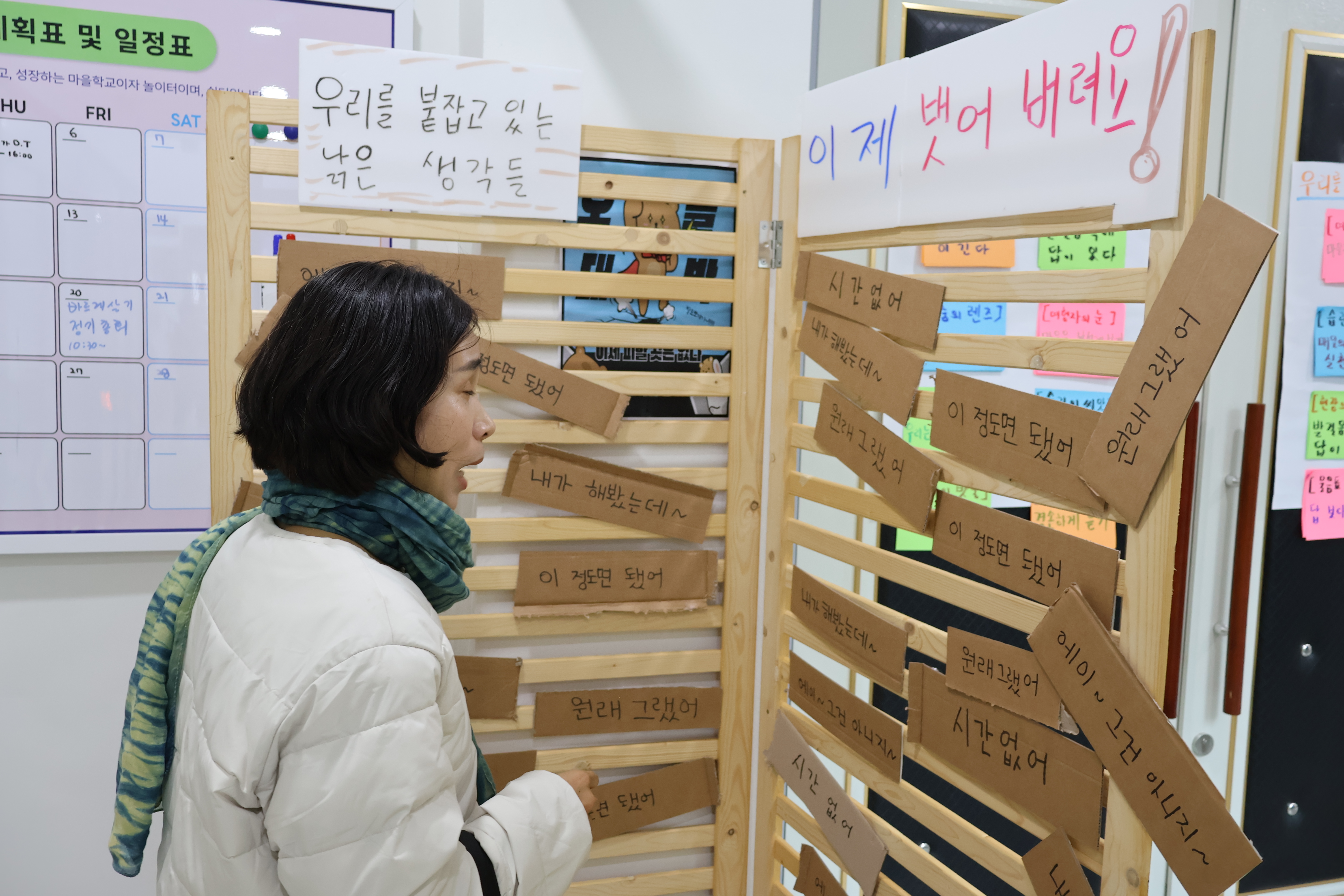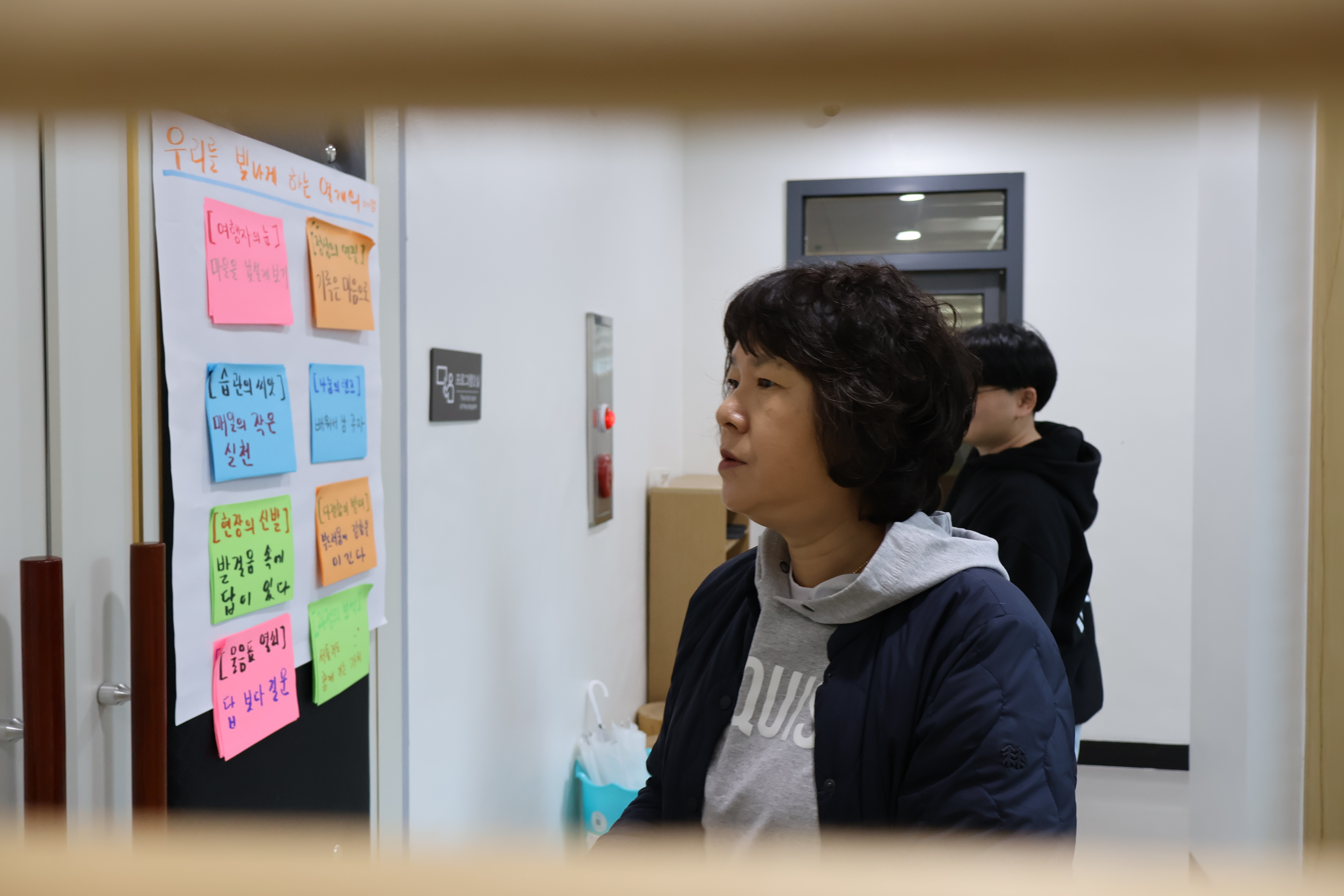 • 낡은 마음을 내려놓은 뒤 실제 프로그램실 입구에 준비된 문에는 활동가로서 가져가야 할 가치와 태도를 제시하였으며, 참여자들은 그중 마음에 와닿는 문장을 선택하며 프로그램실에 입장하도록 구성함. 이를 통해 활동가로서의 새로운 시작과 방향성을 자연스럽게 체감하도록 함.