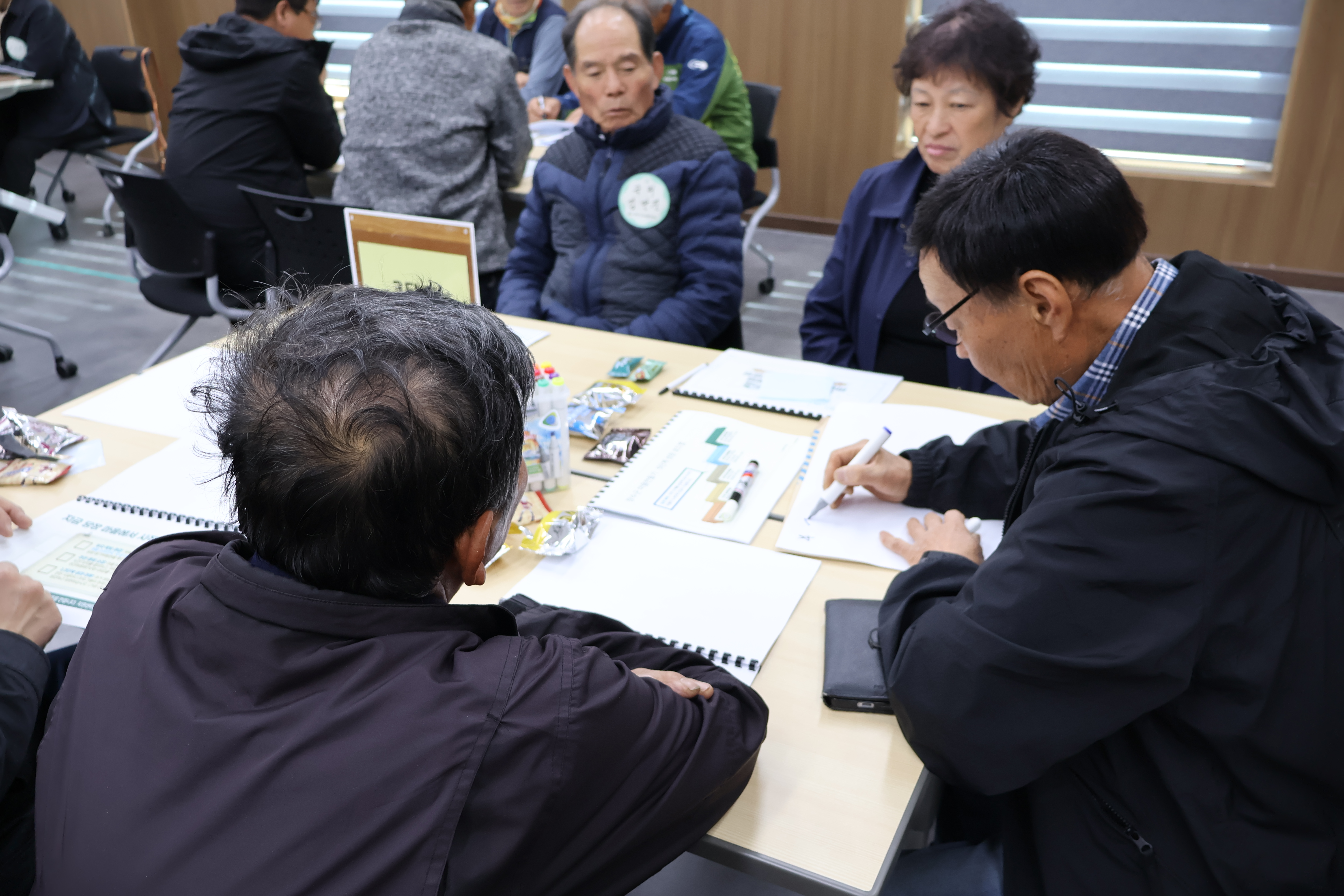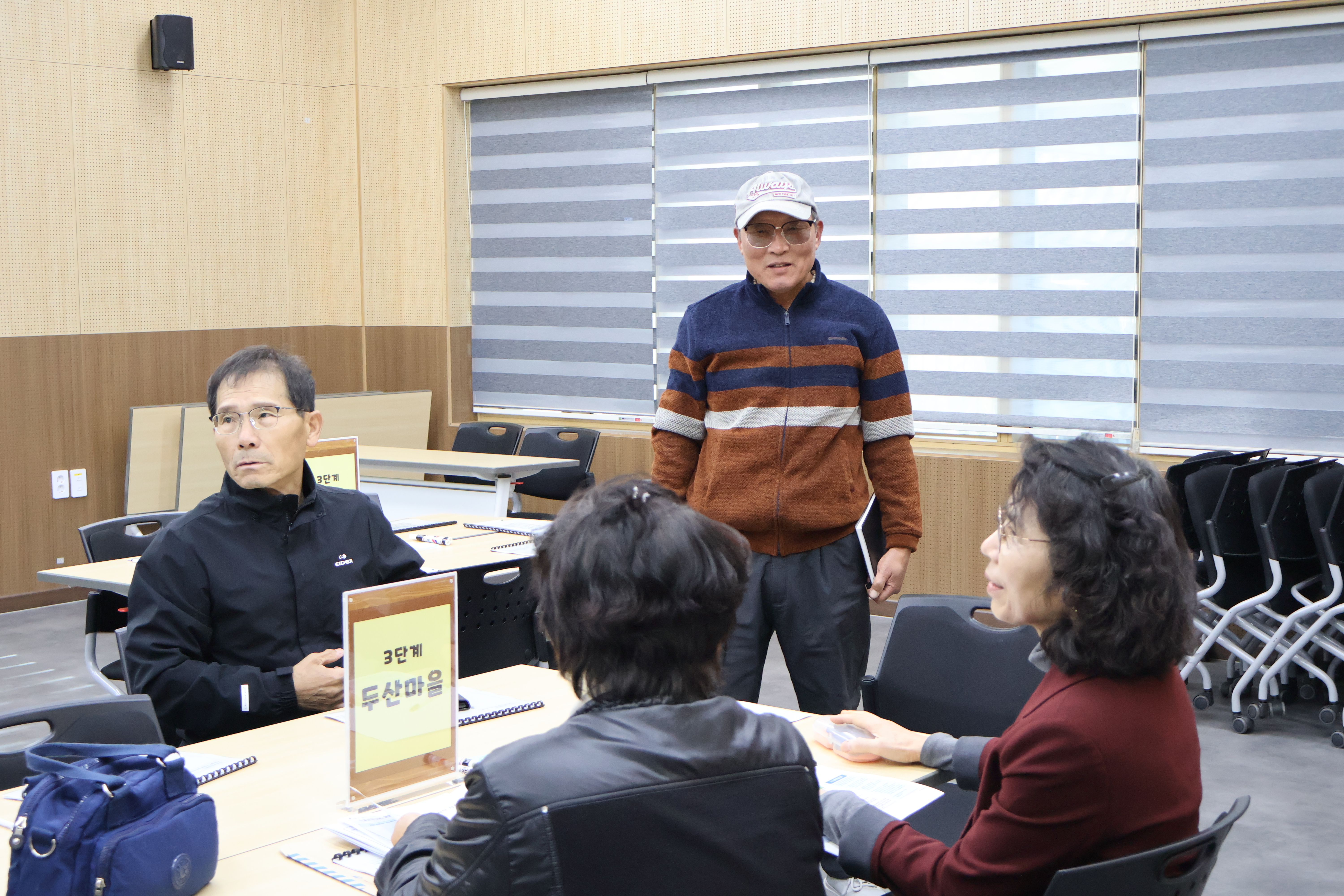 테이블별로 A3 용지와 색연필을 배부한 뒤, “우리 마을은 어떤 마을인가?”라는 질문을 중심으로 짧은 소개 문구 또는 비전을 정리하도록 하였다. 각 마을은 1·2단계를 거쳐온 경험을 바탕으로 마을의 강점, 앞으로 되고 싶은 모습, 자랑하고 싶은 문화와 자원을 표현하였고, 이후 순서대로 발표를 진행하였다.