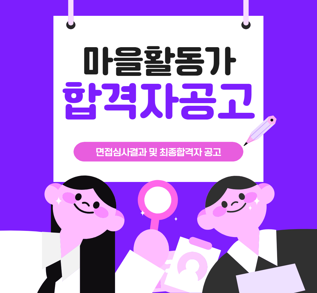 서류 및 면접 심사를 거쳐 최종 선정된 마을활동가 면접심사 결과 및 최종합격자를 다음과 같이 공고합니다.